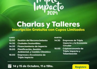 Encuentro triple impacto 2024 por admin | Oct 10, 2024 | Eventos, Noticias, Novedades Compartimos el cronograma de actividades y conferencias del encuentro.
